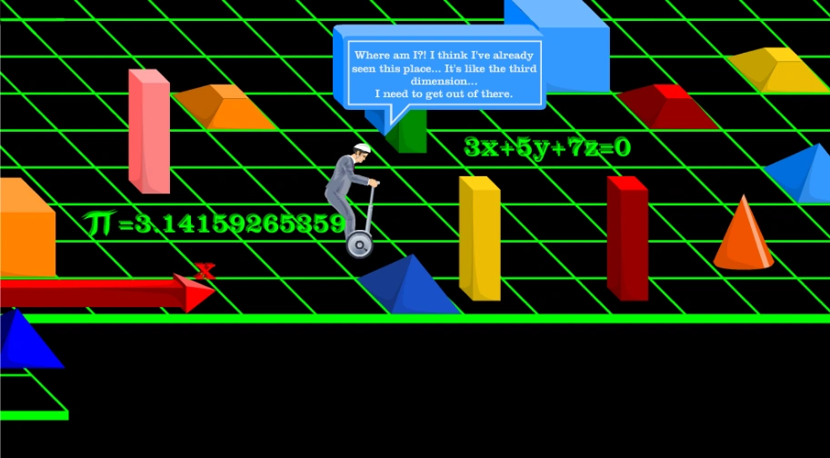 You start off in a generic park looking place, which has a custom lawnmower that is extremely similar to Lawnmower Man's lawnmower, a Wheelchair Guy NPC acting as a hobo, and Helicopter Man and Irresponsible Dad NPCs standing near a Porsche or a Corvette. Then, you meet up with another Wheelchair Guy NPC who is a scientist wanting to show you his lab. When you get into his lab, he needs you to test out his machine. When you go on the machine, it rapidly starts spinning and it transports you into a 3-D land. Segway Man is very confused where he is. Then, the level turns into a small obstacle course with Crushers. You then go on a moving platform which transports you to another place with "moving vectors". You get down to a bridge and then you go on a very fast moving platform that goes down. When you get the entire way down, you go left to pick up some TNT. You then move back to the right.