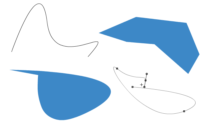 By double-clicking on the polygon, creators can edit vertices. Double-clicking on a vertex causes handles to appear, making the vertex smooth. Moving the handles back to the vertex makes it a corner once again. Holding Alt allows you to move one handle at a time, creating a corner-vertex with a curve leading up to it. Backspace deletes vertices; to add a vertex, click on one of the endpoints of the desired segment and hit Enter. Multiple vertices can be selected by dragging a window around them or by holding Shift; from there they can be moved, deleted, or have points added between them.