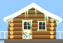 You start outside a lumberjack house, and will start speeding down a snowy hill. Along the way, there is a boost which is supposed to slightly suspend you in mid-air, so you can reach the cliff, ride off the edge, and be lifted by an incline. If you make it, you will reach the top of the next mountain and start "speeding" down that one. If you don't, you'll fall into a pit with a broken down lumberjack house and landmines.