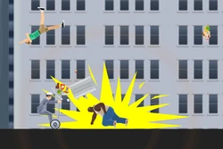 Moving along, you'll end up on the sidewalk, Fatman throws a van, while Moped Girl "dodges" it with the unfortunate death on Pogostick Man. Fatman then uses an unknown power that looks like wind against Effective Shopper, and disappears again. He then reappears up ahead, and, if you move close enough, will perform a backflip, and disappear again. When you move up to the point where he disappeared, he'll appear in that same area (only a bit more to the left) and backflip once more. Fatman will fall down and perform a shockwave explosion, knocking over Irresponsible Dad, his son, and a trash can, then disappear another time.