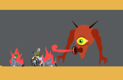 To the left, you go down a level and come to an electric demon thrashing a couple of Segway Guy NPCs. You defeat him by touching him, which results in him turning red and falling apart screaming to his death.