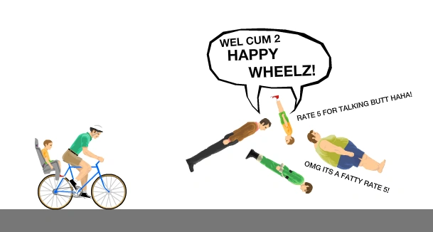 First, there are people floating in the air, with Moped Man and Irresponsible Son's posterior saying "WEL CUM 2 HAPPY WHEELZ!". There is also text above Effective Shopper saying "RATE 5 FOR TALKING BUTT HAHA!" (but this was not intended to break the level rules) and text below her saying "OMG ITS A FATTY RATE 5!".