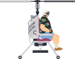 Helicopter Man is the 11th character to Happy Wheels when it was released on December 24th, 2013 in the v1.72 update. He has a light stubble, a white flight helmet with dark blue visor, covering most of his face, wearing a black hawaiian shirt with roses on it, black fingerless gloves, blue shorts, white socks, and brown shoes. He flies a small variation of an auto gyro with a magnet attached. This makes him the first character purposefully capable of flight, as Wheelchair Guy's ability to fly is improvised from his jets. The propeller blades can damage and kill other characters and destroy food items, similar to blade weapons.