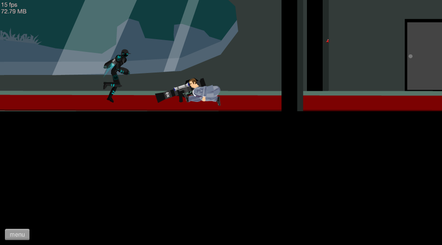You begin as the Jetboy character in a dark scene, with a hovering ship to the left using its headlights to light up the building to the right. You break through the window and knock down a Segway Guy NPC holding a flashlight. A Segway Guy behind him shoots you, but you just knock him down. You pass through a set of doors and come to another room where a Segway Guy tries to snipe at you behind some barrels. After that, you break through the doors and come to an armory, where another Segway Guy standing on a chair shoots at you with a pistol. You break through some glass and come to a hallway where more Segway Guy NPCs shoot at you. After the hallway is another room where a Moped Man NPC comes at you with a sword. You then go up some stairs, at the top of which a Helicopter Man NPC throws a TV at you. Then, you go down another hallway and a Segway Guy shoots a bazooka at you.