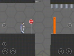 Following this obstacle, the player then reaches a stop sign. The basic objective here is to jump over a hole (as well as a landmine) and continue. However, at the other end of the hole, there is an oscillating thin orange wall. If the player’s timing is wrong, the wall will temporarily block the player’s path, which may cause them to fall onto the landmine (which, in turn, may launch the player into a ceiling of spikes). If the player falls into the hole, a boost will send them flying out of the hole and into a separate room above, where they will be shot by two harpoon guns and then blown up by two homing mines.