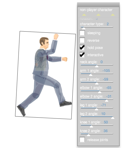 NPCs have unique options as compared to special items. Players may adjust the character's limb joints, including their arms, legs, elbows, knees, and necks, by either using the sliders to adjust the angles or by double clicking on a limb and dragging it to the desired pose. NPCs can be flipped horizontally, set to sleeping, and interactivity is adjustable. They can also be set to "hold pose", which, as the name suggests, has the character hold their pose instead of simply going limp once the level is loaded. Prior to the v1.75 update, this option meant that they would be completely still (almost as if they were set to the "sleeping" option). After said update, the option still made NPC's hold their pose, but there would be some joint movement involved to make it seem somewhat more "natural".