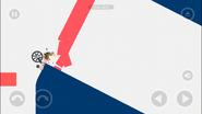 As the player traverses through this route, they come to another obstacle, where the character must swiftly pass by three crushers (each crusher comes in the form of a thin rectangle with a ball attached to the top). They are initially hidden from view, but one-by-one they shoot out from the ground, before being lowered back underneath the ground and being hidden from view once more. Because of the way they are shaped and that they are not too fast and powerful, coming into contact with one of these crushers will not kill the character. (However, if the character is directly above where the crusher will appear from, the crusher will push the character up into a ceiling of spikes.) Once the player has passed this, they will reach a large pink, rotating gear. The player then moves the character so that the character sits in-between a pair of teeth from the gear. Since the gear is rotating clockwise, the gear will transport the character to the other side, where the player can then head down a few blue blocks and enter a pink structure. This structure can be thought of as a hollow rectangle, with the exception that one side (i.e. the side where the character enters) is missing. When the character is at the other end of the structure, the structure suddenly starts to rotate clockwise until it is facing the other way. After it has stopped rotating, the player can now exit from where they entered and continue the level. Immediately after exiting, the player crosses two swinging platforms and returns to the ground. (Everything from the gear up to the swinging platforms is suspended in the air, which means that the character can fall off into the abyss below).