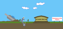 The level starts with a crashed UFO from mgmartinec's previous level, The Astro Avenger. You enter Jermombo State Park, which is hosting a renaissance fair. You jump over a bridge in the playground and some monkey bars, which Irresponsible Dad's son is playing on (be careful not to jump here or the segway will get stuck), you then pass a seesaw with another NPC, a sandbox, with another Irresponsible Dad's son as well, and Moped Girl sitting on a bench reading. You enter the fair, where Wheelchair Guy and Segway Guy NPCs are in jousting gear. After jumping over some bales of hay, an elf is dancing in a shelter, which you lower the roof of to crush him. There are then more people in renaissance clothing.