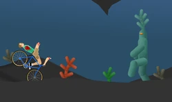Even though you are now underwater, the water has no impact on you. You pass through a small glass tunnel, go forward, and you stop at a green pipe. Light shines on a green-blue piece of coral, which is a different color than the rest of the coral, and a green-blue monster will come up from the ground and start chasing you. You must go back, and enter the hole behind you. Once you enter the hole, you fall down slightly, go forward. You then exit the hole, knock down a pipe, ride over another pipe. Another pipe swings down that you must avoid. Now, you see a submarine with a light shining out of it's middle window. The submarine is over a hole. You hear a Wheelchair Guy NPC yell "Save me!", the submarine will fall in the hole, and he will scream again. Next, you enter the hole that the submarine fell into. Once you enter the hole, you fall down, go forward, and you enter a land the exact same as the very beginning.