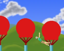 The next obstacle is the "sucker punch wall", but since Happy Wheels is a 2D game, the punching arms are on the ceiling rather than the wall. There are seven punching arms that may kill you if they punch you hard enough. Due to its spread, this will usually be the end of the line for larger characters like Helicopter Man. You'll then reach the "big balls" obstacle, but you must be fast or else your path will be blocked. Like in the show, the red balls are "rubbery", but they are not very dense. If you fall, spikes will crush you. Be careful when you try to reach the next obstacle. There is a spike set next to and above the last ball.